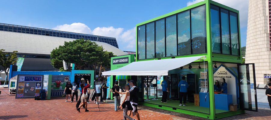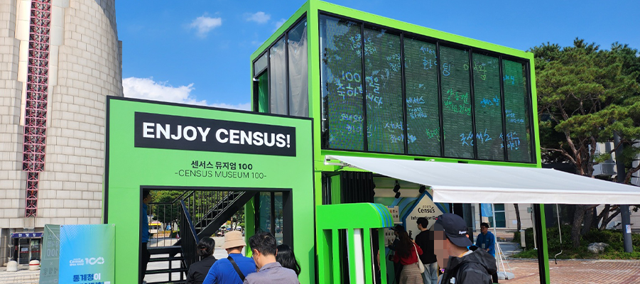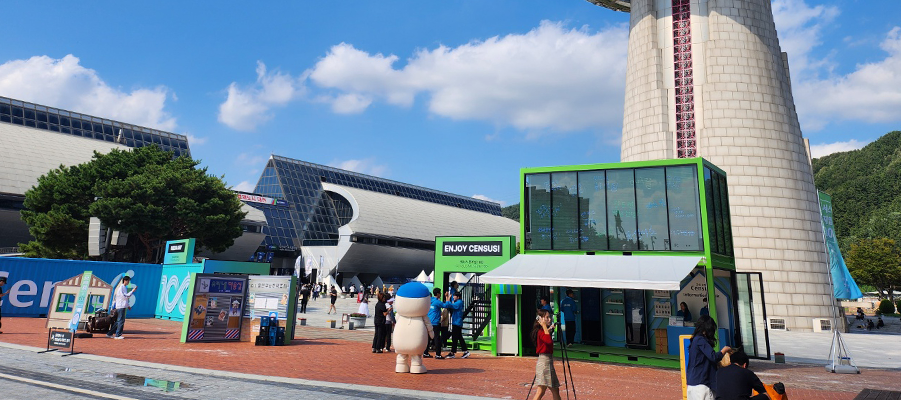 또한, 전시를 관람한 후, 외부 전화부스 컨셉의 메세지월 키오스크를 통해 센서스를 응원하는 말, 소감, 하고 싶은 이야기 등을 자유롭게 입력하면 즉시! 외부 컨테이너 LED 화면에 실시간으로 노출되는데요. 그 앞에서 인증샷도 남기고 추억도 담아가는 공간으로 변신! 이처럼 딱딱할 것만 같던 통계 전시를 참여형, 체험형 디지털 콘텐츠로 풀어낸 이번 프로젝트는 데이터를 보다 가깝고 흥미롭게 느낄 수 있었던 특별한 팝업 전시 업그레이드 완료! 이 센서스 뮤지엄 100 팝업은 한 달간 전국 순회 중입니다! 대전 → 부산 → 서울 → 속초로 이어지니, 근처에서 열린다면 꼭 한번 들러보세요 🙂
