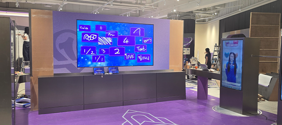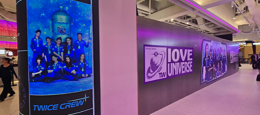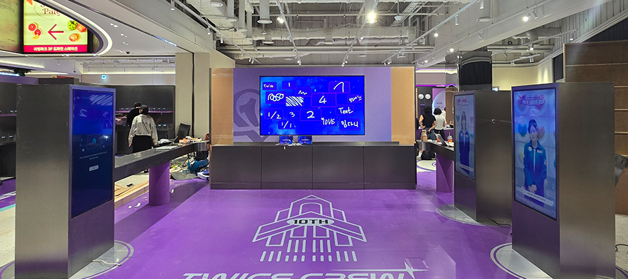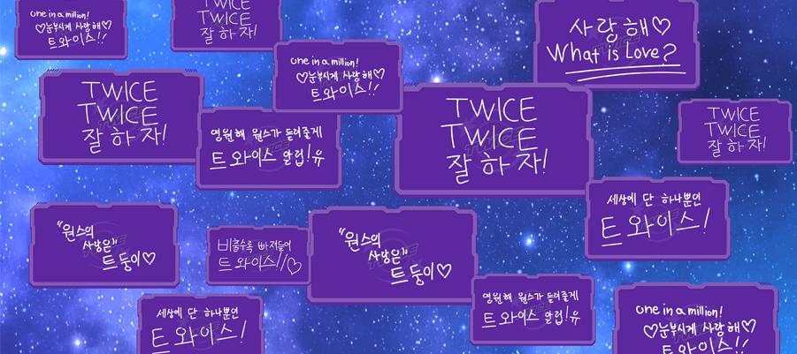 용산 아이파크몰에서 진행되는, 데뷔한지 10년을 맞이한 최정상 걸그룹 트와이스의 팝업 이벤트에 팬과 아티스트 간 소통을 위한 디지털 메세지월을 설치하였습니다. 현장을 찾은 팬들은 전시 공간 내 메세지월에서 트와이스에게 보내는 응원의 메시지를 직접 작성한 후, [전송하기] 버튼을 누르면, 9명의 멤버 각각의 키 컬러를 상징하는 하트 이펙트(VFX)가 스크린 위로 날아오르며 트와이스를 사랑하는 팬의 마음이 전달되는데요.