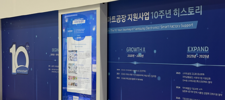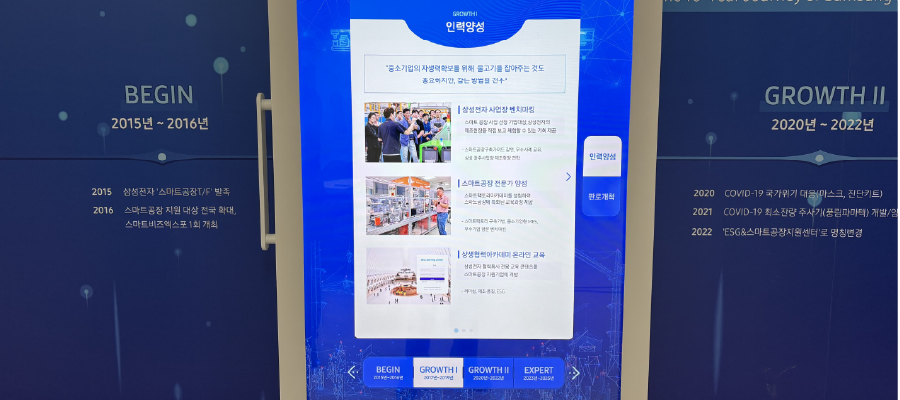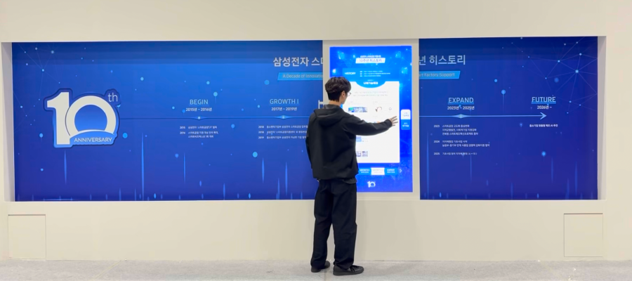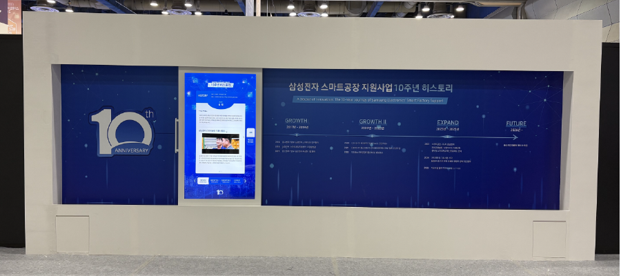 서울 강남 코엑스 B홀에서 열린 스마트비즈엑스포 2025에 삼성전자의 대·중소 상생형 스마트공장 지원 사업 10주년을 기념해 대형 인터랙티브 타임라인 콘텐츠를 설치하였습니다. 총 6미터 길이의 타임라인 벽면과 슬라이딩 방식의 65인치 터치 디스플레이를 통해 관람객이 화면을 직접 이동시키고 궁금한 내용을 선택(터치)하며 연혁과 주요 성과를 영상으로 확인할 수 있도록 구성했습니다. 지정된 위치에 도달하면 해당 구간에 맞는 스토리와 사례가 자동 재생되어 10년간 2,500여개 중소기업을 지원해온 삼성전자의 스마트공장 사업 흐름을