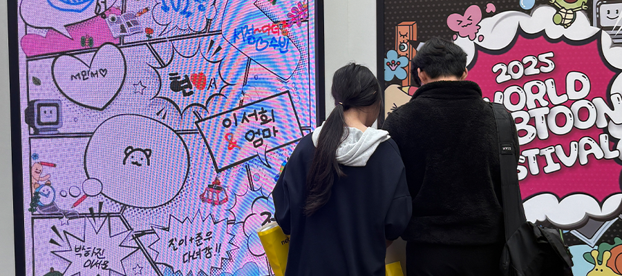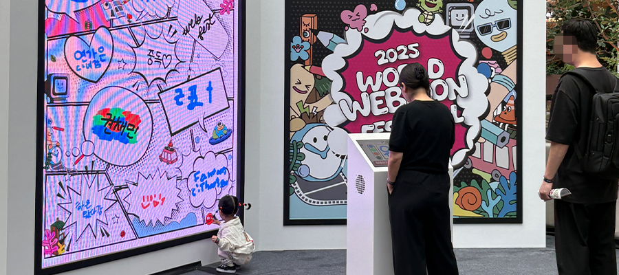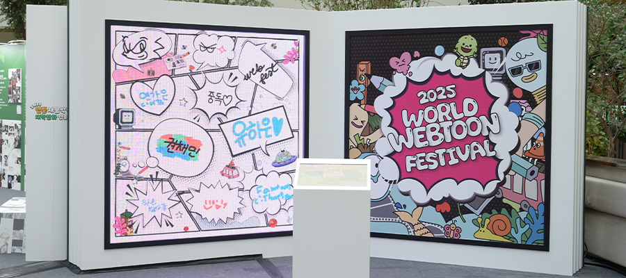 지난 10월 19일부터 22일까지 잠실 롯데월드 아이스링크장에서 열린 2025 월드 웹툰 페스티벌에 메세지월을 설치하였습니다. 문화체육관광부와 한국콘텐츠진흥원이 주최한 이번 페스티벌은 ‘웹툰 종주국’이라는 위상에 걸맞게, ‘모바일을 넘어 현실에서 즐기는 웹툰’이라는 주제로 무대, 전시, 체험 등 다양한 콘텐츠가 가득했던 행사였는데요.