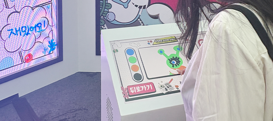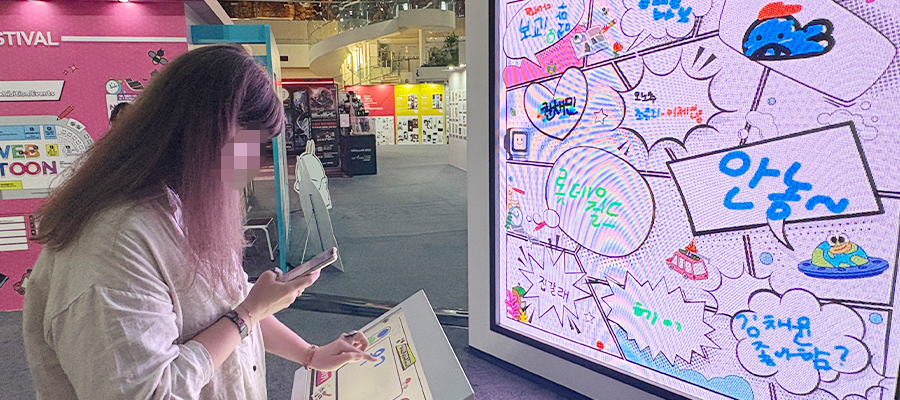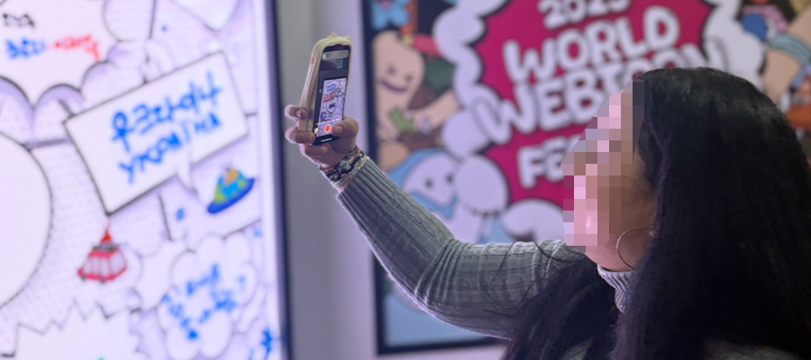 웹툰 페이지를 닮은 디자인 안에 관람객이 직접 메시지를 작성하면 말풍선 속에 그 문장이 연출되도록 구성했고, 다양한 웹툰 캐릭터들이 말풍선 주변에서 움직이는 VFX 효과까지 더해져 메세지를 남기는 그 순간 자체가 하나의 연출이자 인증샷 명소가 되었답니다. 특히나 외국인들에게 인기 만점!! 평소엔 화면으로만 보던 웹툰을 현장에서 직접 보고, 만지고, 남기고, 즐기는 경험 속에서 메세지월은 팬들의 마음을 표현하고 공유하는 창구 역할을 톡톡히 해낸거 같아 뿌듯헸습니다.^^