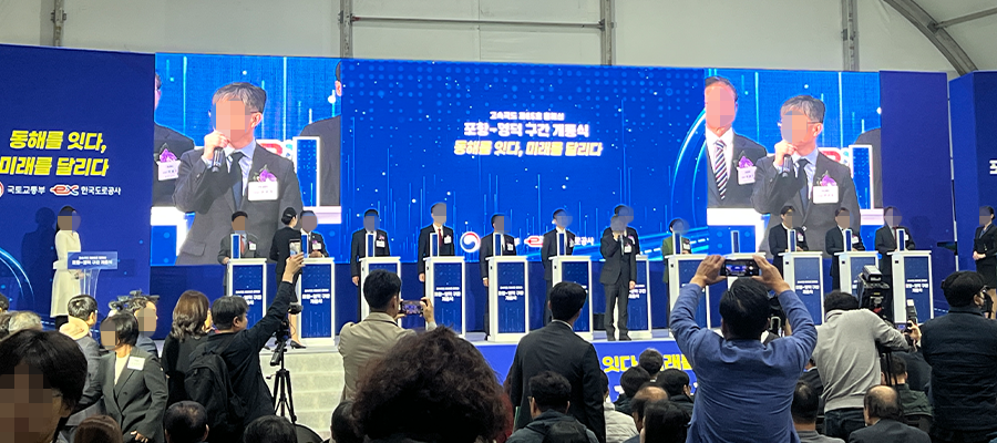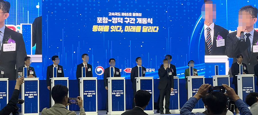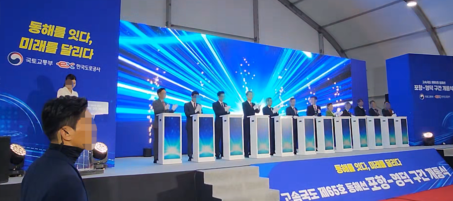 고속국도 65호선 포항~영덕 개통식 현장에 오프닝터치포디움을 설치해 개통 세리머니를 함께했습니다. 포항휴게소에서 열린 이번 행사에서 귀빈이 포디움을 터치하면 대형 스크린과 연동된 개통 축하 그래픽이 펼쳐지는 방식으로, 기존의 리본 커팅 대신 더 스마트하고! 세련된! 디지털 개통식을 연출했어요. 포항~영덕 구간은 9년 만에 완공된 30.92km의 신규 구간으로 이동 시간이 절반 이상 단축되는 만큼 지역에서도 큰 기대를 모았는데요,저희의 오프닝터치포디움이 행사 분위기를 한층 더 Up시켰다고 자부합니다.^^