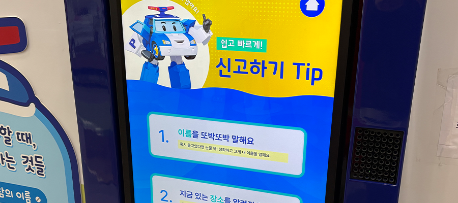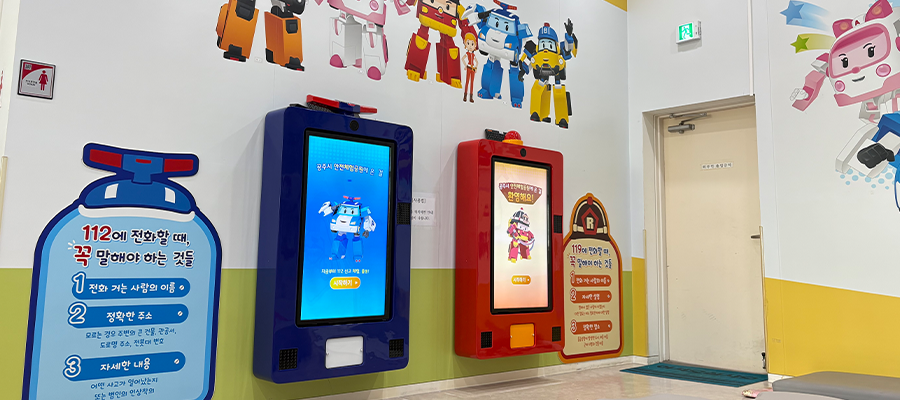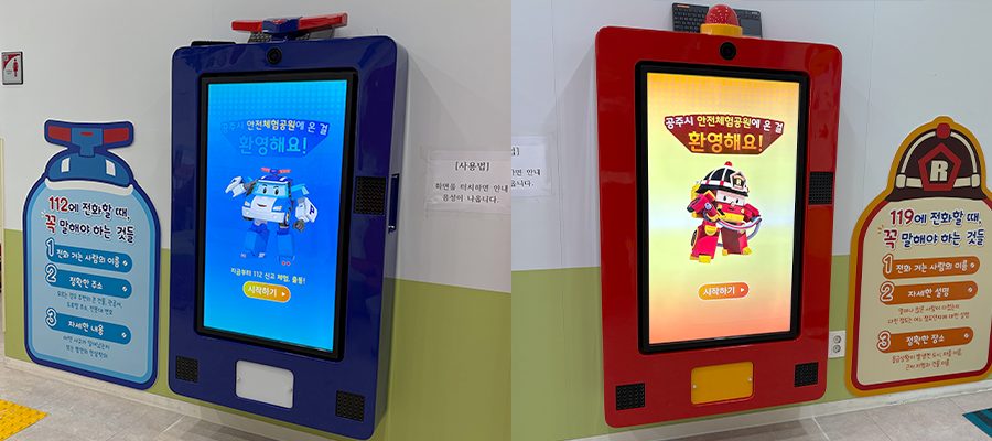 공주시 안전체험공원 내 ‘로보카 폴리 어린이 안전체험관’의 112·119 신고 교육 키오스크를 리뉴얼하였습니다.이번 키오스크는 아이들에게 친숙한 폴리·로이 캐릭터가 등장해, 위급 상황에서 어떻게 신고해야 하는지 단계별로 안내하고 직접 체험할 수 있도록 구성하였는데요. 로보카 폴리의 대표 캐릭터인 폴리와 로이가 각 상황별 시나리오에 맞춰 112, 119 신고 방법을 쉽고 친절하게 설명해 주며, 아이들은 안내된 문장을 따라 말하면 음성 인식을 통해 실제 신고 절차를 시뮬레이션할 수 있답니다. 갑작스러운 사건·사고에 대비해 어린이들이 차분하게 상황을 설명하고 도움을 요청하는 법을 연습할 수 있도록 설계된 체험형 안전 교육 솔루션으로, 친숙한 캐릭터와 학습 콘텐츠가 자연스럽게 결합되어 재미와 교육 효과를 동시에 잡은 키오스크입니다.