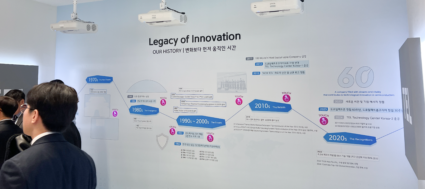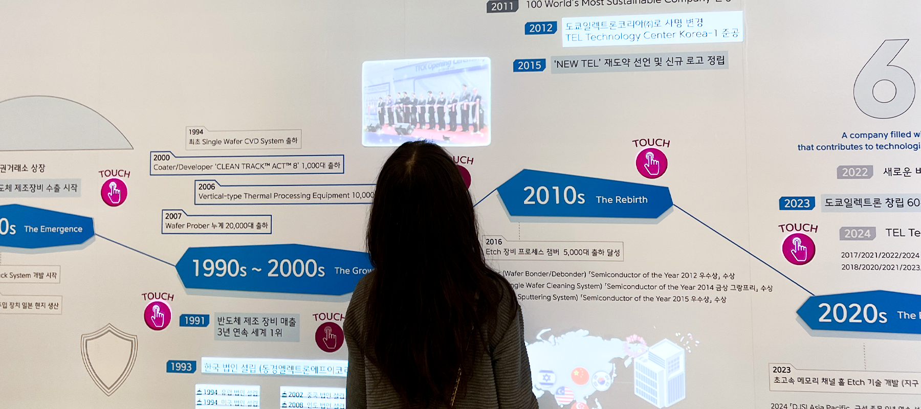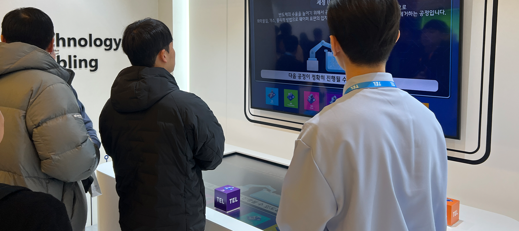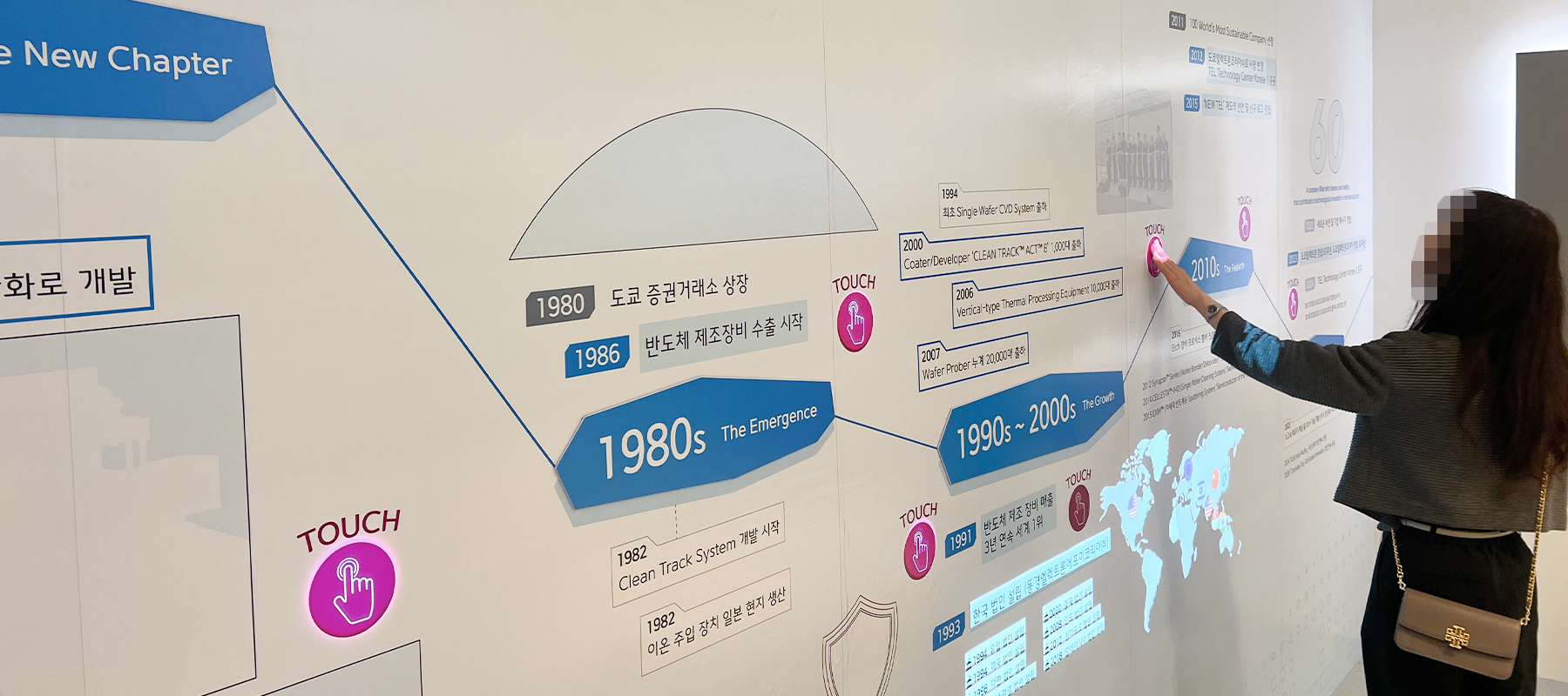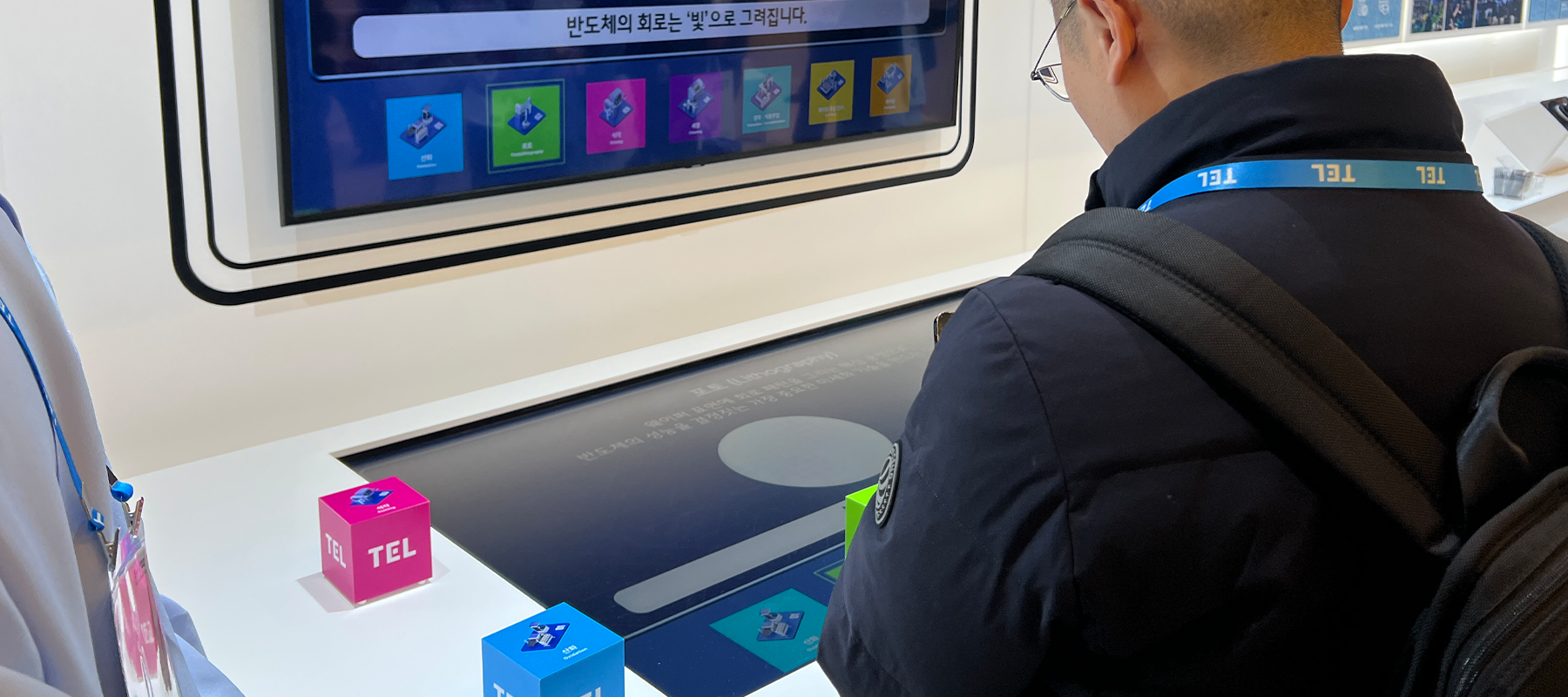 매직월은 1960년대부터 현재까지 이어지는 TEL의 연혁과 주요 성과를 터치 기반 애니메이션으로 구성해, 방대한 히스토리를 한눈에 탐색할 수 있도록 구현했습니다. 또한, 스크린큐브는 반도체 생성 과정을 주제로, 총 7개의 큐브를 스크린 위 지정 위치에 올리면 관련 콘텐츠가 자동 재생되는 방식으로 설계했습니다. 복잡하게 느껴질 수 있는 기술 정보를 ‘선택 > 내용 확인’의 간단한 흐름으로 풀어내 이해도를 높였습니다. 두 솔루션 모두 최소한의 직관적인 조작만으로도 높은 몰입감을 제공하며, TEL이 전달하고자 한 메시지를 효과적으로 경험할 수 있도록 구성되었습니다.