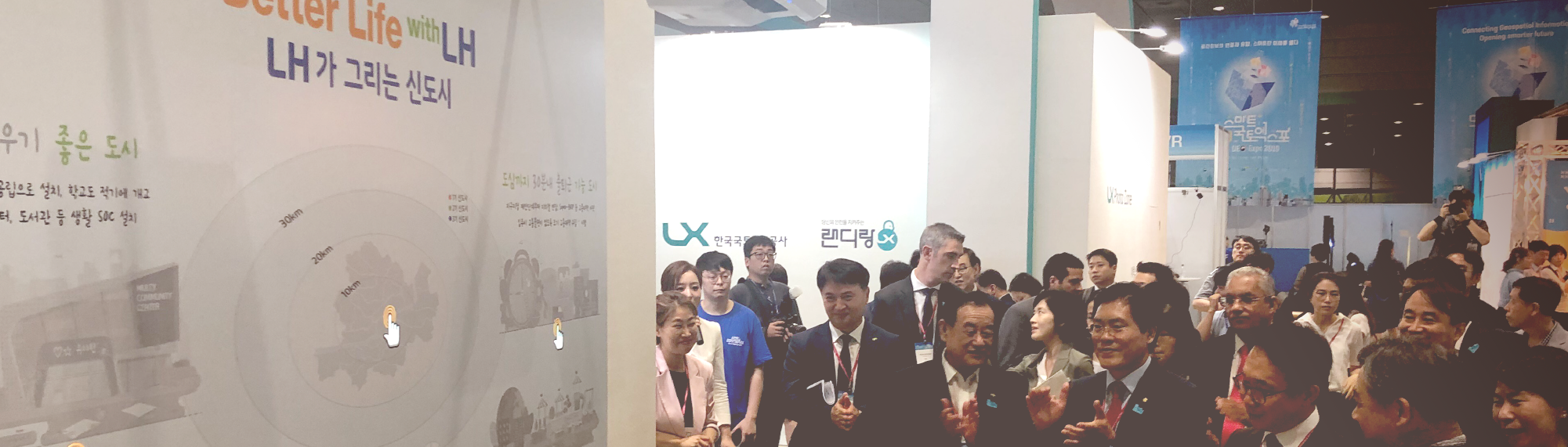 공간정보의 연결과 융합, 스마트한 미래를 여는 ‘제12회 2019 스마트 국토엑스포’가 8월 7일 코엑스에서 개최되었습니다. 2박 3일간의 일정으로 진행되는 이번 행사는 4차산업혁명에 발맞춘 최첨단 기술을 소개하며 청년들을 위한 취업과 창업에 대한 투자지원 설명회로 다양하게 진행이 되었습니다. LH(한국토지주택공사)가 담당하는 부스에서 에이블랩은 매직월을 통해서 ‘Better Life with LH – LH가 그리는 신도시’를 표현해 보았습니다. 과거 서울에만 집중되는 인구과부화를 LH의 도시개혁을 통해 넓고 쾌적하고 여유로운 신도시 생활을 주제로 스토리를 만들었습니다