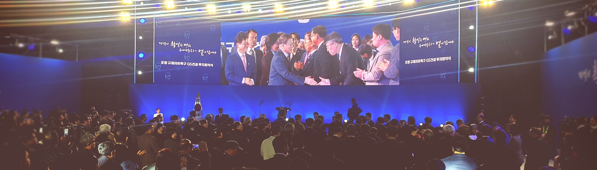 포항종합운동장 체육관에서 문재인 대통령이 참석한 가운데 ‘포항 규제자유특구 GS건설 투자 협약식’ 을 가졌습니다. 많은 분들이 찾아주셨는데 , 대표적으로 문재인 대통령님 , 청와대 김상조 정책실장님, 강기정 정무수석님, 황덕순 일자리수석님과 박영선 중소벤처기업부 장관님, 송재호 국가균형발전위원장님 이 참석해 주셨습니다. GS건설은 협약식에서 포항 규제자유특구 약 12만㎡ 규모의 부지에 2차 전지를 재활용하는 사업에 대한 투자 계획을 발표했습니다. 약 1000억원 가량을 투자하여 유가 금속을 생산할 수 있는 시설을 운영할 예정이라고 합니다 . 축사를 맡아주신 문재인 대통령님은 포항 경제가 새롭게 도약하는 확실한 계기라고 말을 해주셨습니다.