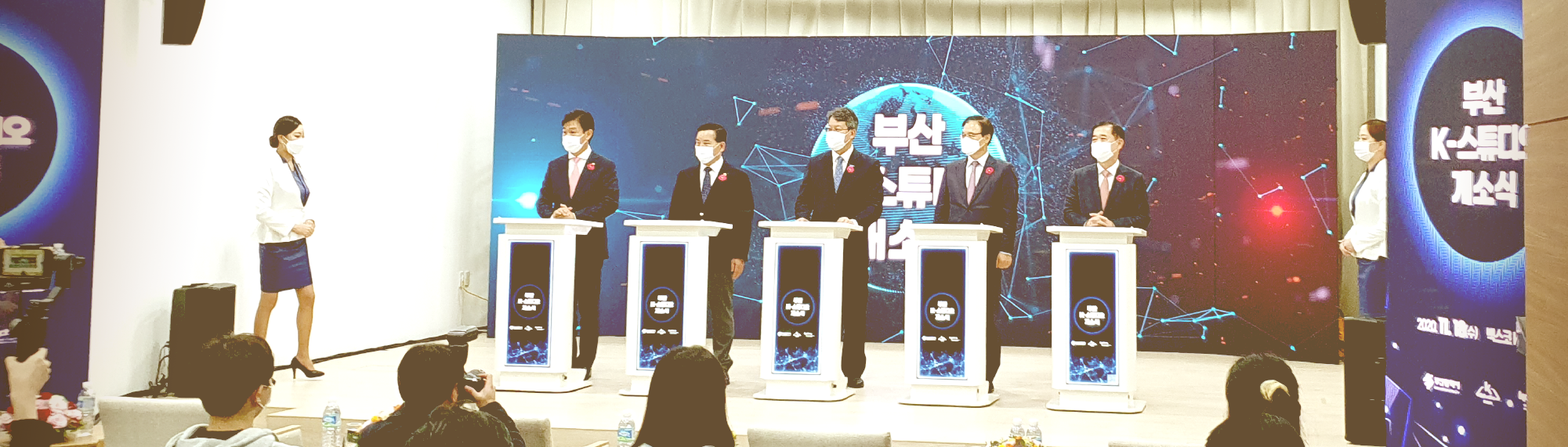 부산 벡스코에서 지난 18일 K-스튜디오 개소식을 진행하였습니다. 당일 K-스튜디오에는 KOTRA 권평오 사장님,변성완 부산시장님 등 주요 참석자분들이 참석해 주셨습니다. 권평오 코트라 사장님은 “포스트 코로나 시대 , 디지털 무역 중심이 될 K-스튜디오를 적극 활용해 지역 중소·중견기업이 해외마케팅 방식을 혁신하도록 돕겠다” 라는 이야기를 해주셨습니다. 당일 개소식과 함께 코트라 수출스타 디지털 마케터즈 1기 임명식 도 진행되었습니다.