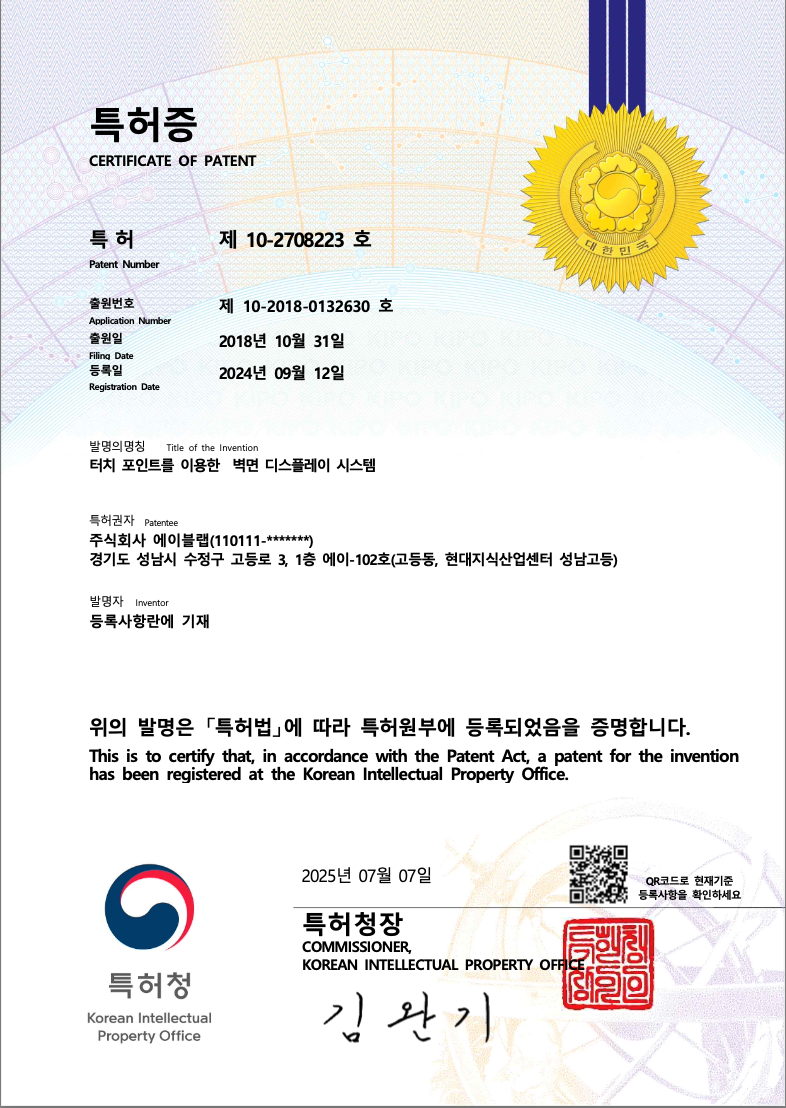 [ 특허등록 ] 「터치포인트를 이용한 벽면 디스플레이 시스템 (10-2708***)」